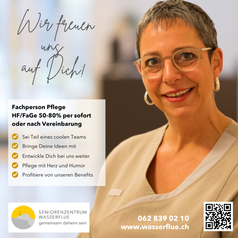 Du darfst Dich ohne Motivationsschreiben - mit dem Betreff Fachperson Pflege - per Mail an hr@wasserflue.ch bewerben, herzlichen Dank.